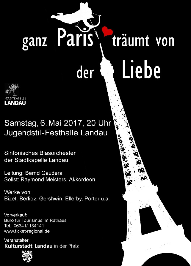 Die Rheinpalz berichtete am 10.05.2017 mit folgendem Artikel über unser Konzert: Ein Konzert zum Träumen präsentierte das sinfonische Blasorchesters der Stadtkapelle Landau. Die Festhalle war passend gewählt zum Motto des Ensembles: „Ganz Paris träumt von der Liebe“. Wunderbare Klänge zogen sich durch die Räume und der Besucher musste nur die Augen schließen, schon befand er sich in seiner Fantasie mitten in Paris. Der erste Teil dieses Konzerts stand ganz im Zeichen der Französischen Revolution. Ein Paradebeispiel hierfür ist die Sinfonie von Louis Emanuel Jadin, welche er zum fünften Jubiläum des Sturmes auf die Bastille im Jahre 1794 komponiert hatte, genauso wie Georges Bizets „L’Arlesienne Suite No. 2“. Allerdings ging es damals nicht so sehr ums Schauspiel, sondern eher um die beeindruckende Musik Bizets.Eine ungewöhnliche Zusammenstellung von Dirigent Bernd Gaudera sorgte für etwas Heiterkeit. Aus „Pariser Sketches“ von Martin Ellerby wählte der sympathische Musikleiter die Stücke „Père Lachaise“ und „Pigalle“ – also Friedhof und Amüsement. Eindrucksvoll war es allemal. Mit der volkstümlichen Variation des Volkslieds „Sur le pont d’Avignon“ von Franco Cesarini entließen die Musiker ihr Publikum anschließend in die Pause. Der zweite Teil des Konzertes bezog sich auf das Pariser Lebensgefühl der 1920er- bis in die 1960er-Jahre. Musikleiter Gaudera konnte es sich nicht verkneifen, mit einer Baskenmütze auf dem Haupt vor das Publikum zu treten. Von der Musik George Gershwins inspiriert, tanzte dieses Mal Gene Kelly vor dem inneren Auge. Singend vor Freude wirbelte er durch die Straßen zur Musik des Musicals „An American in Paris“. Einer der Höhepunkte war Raymond Meisters mit seinem Akkordeon. Bei Astor Piazollas „Adios Nonino“, begleitet vom Blasorchester, lag ihm das Publikum zu Füßen. Obwohl Piazolla eigentlich ein Vollblut-Tangomusiker war, passte das bekannte Stück punktgenau in die Aufführung. Ein Medley bekannter Melodien, wie „Sous le ciel de Paris“, „Moulin Rouge“, „La vie en rose“ oder „C’est si bon“, arrangiert von Toshio Mashima, inspirierte die Zuschauer im ausverkauften Saal zum Mitmachen. Da wurde geklatscht, gesungen (eher etwas leise) und kräftig mit den Füßen gewippt. Oder so wie Conferenciere Helga Schreieck schmunzelnd erklärte: „Von einem Pfälzer Dirigenten und seinen Musikern französische Lieder in einem Arrangement von einem japanischen Komponisten gespielt – das ist wahrlich multi-kulti. Und genau das ist Pariser Flair.“ Zum Schluss des gelungenen Konzerts intonierten die Musiker „Ganz Paris träumt von der Liebe“, eigens arrangiert vom Dirigenten Bernd Gaudera, diesmal in einem eleganten Sommerhütchen. Paris, ein Freudenkelch der Welt und immer noch die Stadt der Liebe und des Charmes. Am Wochenende konnte man in Landau den Frühling in Paris hören. Autorin: Vera Allmann-Stübinger |